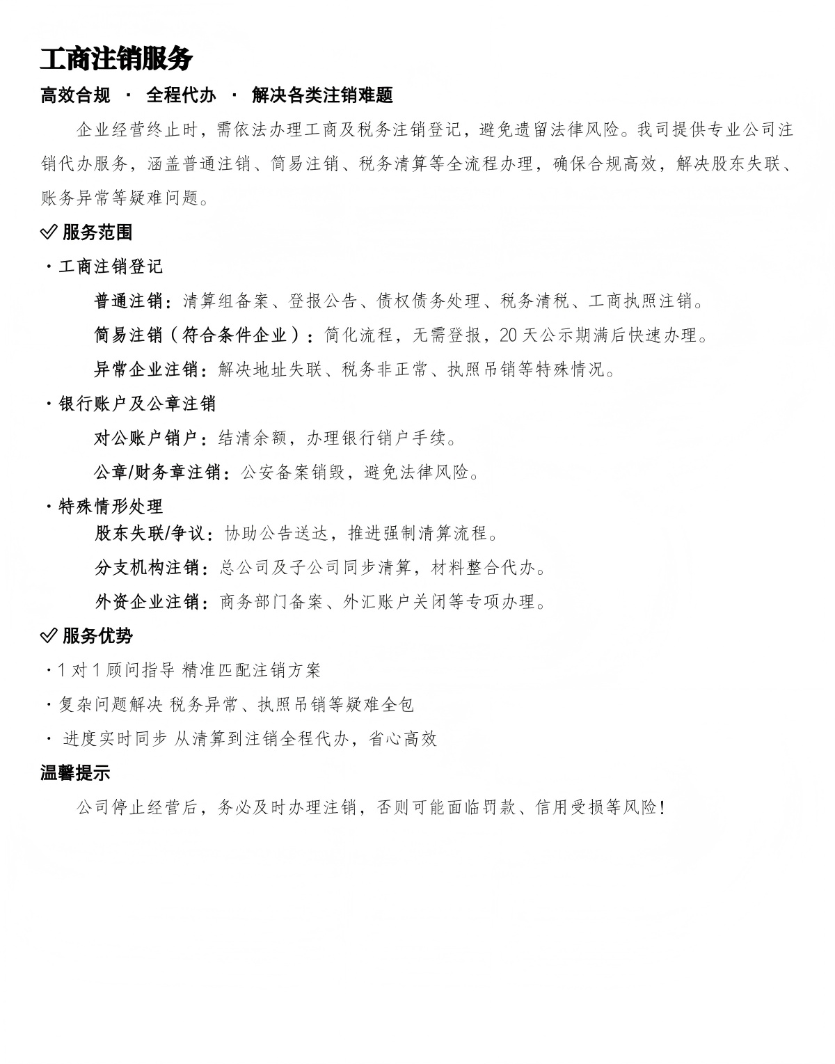 提供专业公司注销代办服务,涵盖普通注销、简易注销、税务清算等全流程办理,确保合规高效,解决股东失联、账务异常等疑难问题。