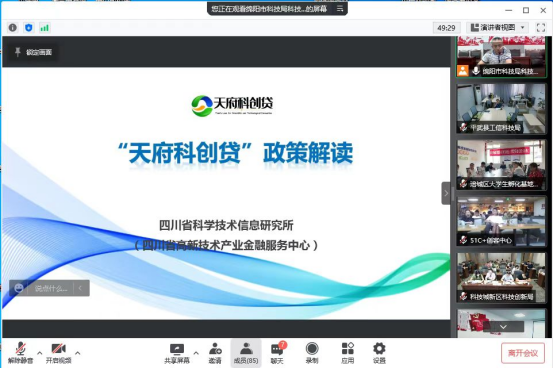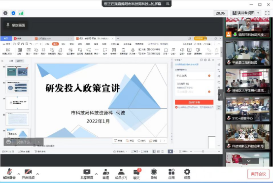 2022年7月7日(星期四)14:00,由市科技局主办的“科技领域稳增长政策宣讲培训会”线上会议。绵阳融鑫孵化器及时通知园区内45余家在孵企业,及时下载相关视频软件,组织企业准时观看并学习会议内容。